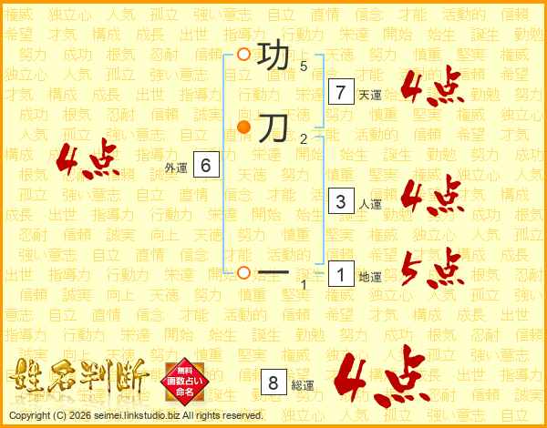 生活面を象徴する運勢です。外部から受ける影響力を表し、結婚運、家庭運や職場、環境への順応性を表します。総運から人運を引いた画数。姓や名が1文字の場合を除く。