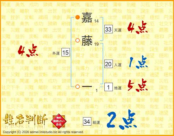 生活面を象徴する運勢です。外部から受ける影響力を表し、結婚運、家庭運や職場、環境への順応性を表します。総運から人運を引いた画数。姓や名が1文字の場合を除く。