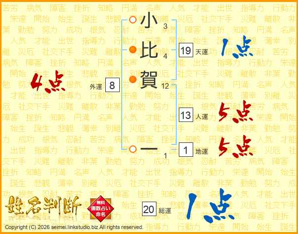生活面を象徴する運勢です。外部から受ける影響力を表し、結婚運、家庭運や職場、環境への順応性を表します。総運から人運を引いた画数。姓や名が1文字の場合を除く。