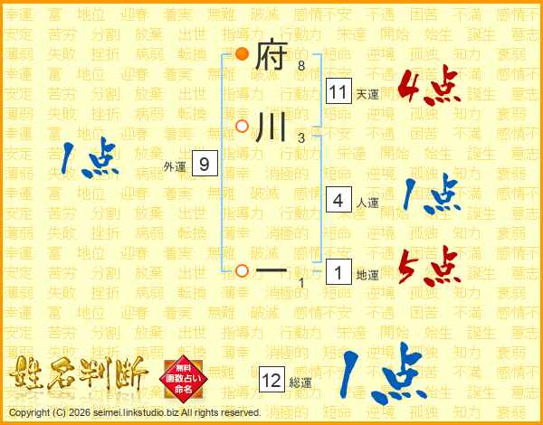 生活面を象徴する運勢です。外部から受ける影響力を表し、結婚運、家庭運や職場、環境への順応性を表します。総運から人運を引いた画数。姓や名が1文字の場合を除く。
