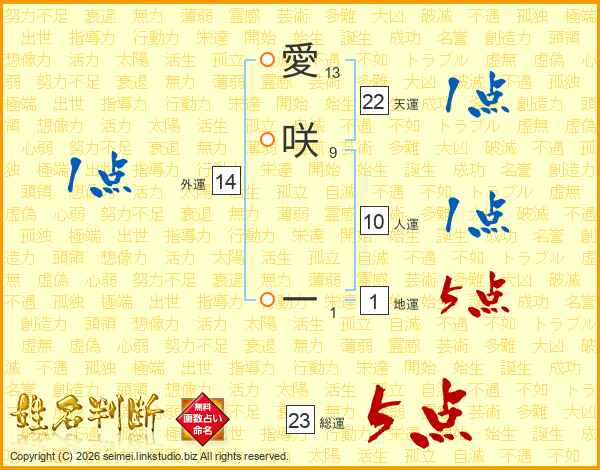生活面を象徴する運勢です。外部から受ける影響力を表し、結婚運、家庭運や職場、環境への順応性を表します。総運から人運を引いた画数。姓や名が1文字の場合を除く。