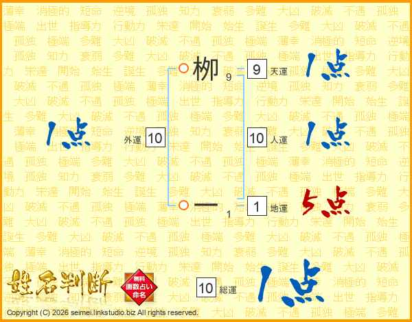 生活面を象徴する運勢です。外部から受ける影響力を表し、結婚運、家庭運や職場、環境への順応性を表します。総運から人運を引いた画数。姓や名が1文字の場合を除く。