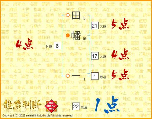 生活面を象徴する運勢です。外部から受ける影響力を表し、結婚運、家庭運や職場、環境への順応性を表します。総運から人運を引いた画数。姓や名が1文字の場合を除く。