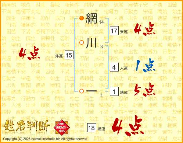 生活面を象徴する運勢です。外部から受ける影響力を表し、結婚運、家庭運や職場、環境への順応性を表します。総運から人運を引いた画数。姓や名が1文字の場合を除く。
