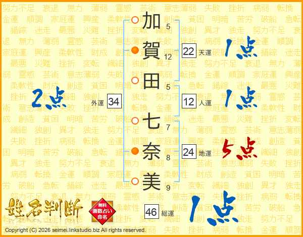 加(5画)賀(12画)田(5画) 七(7画)奈(8画)美(9画)