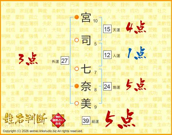 宮(10画)司(5画) 七(7画)奈(8画)美(9画)