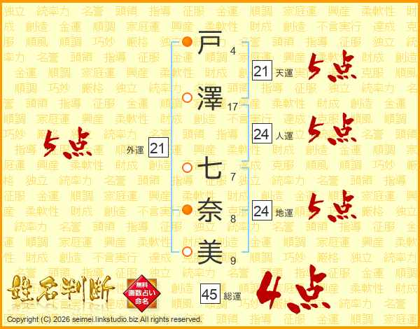 戸(4画)澤(17画) 七(7画)奈(8画)美(9画)