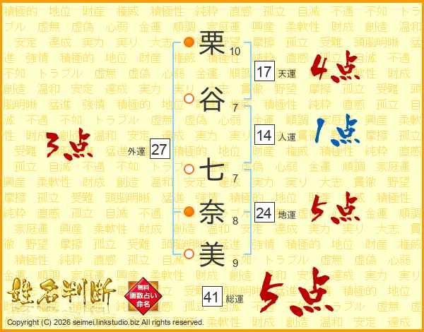 栗(10画)谷(7画) 七(7画)奈(8画)美(9画)