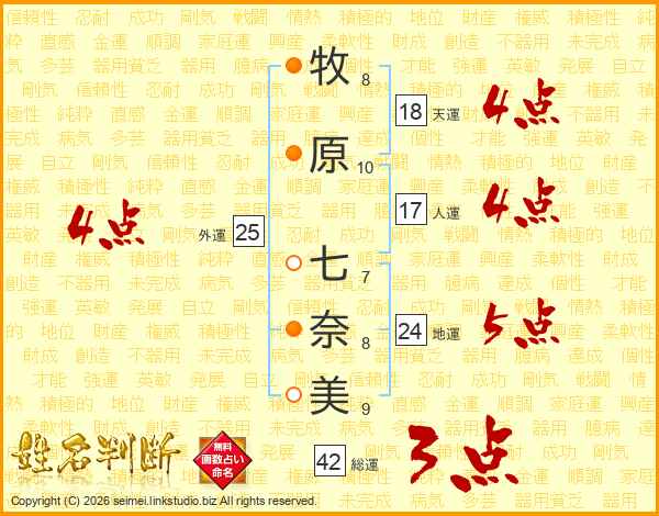 牧(8画)原(10画) 七(7画)奈(8画)美(9画)