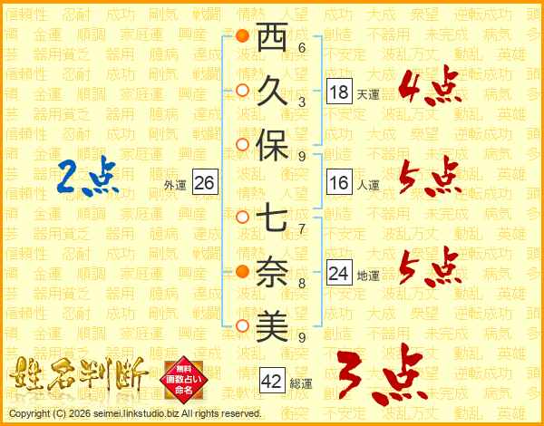 西(6画)久(3画)保(9画) 七(7画)奈(8画)美(9画)