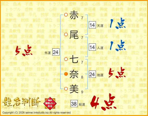 赤(7画)尾(7画) 七(7画)奈(8画)美(9画)