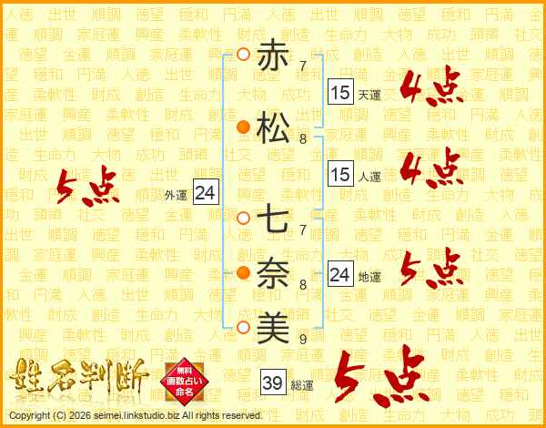 赤(7画)松(8画) 七(7画)奈(8画)美(9画)