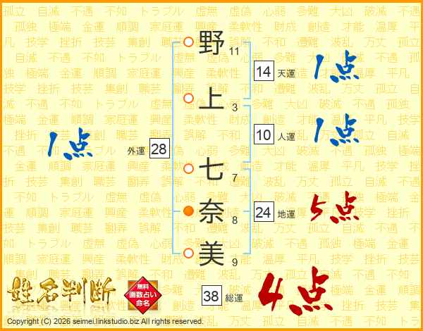 野(11画)上(3画) 七(7画)奈(8画)美(9画)