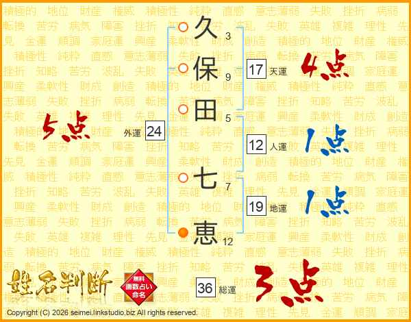 久(3画)保(9画)田(5画) 七(7画)恵(12画)
