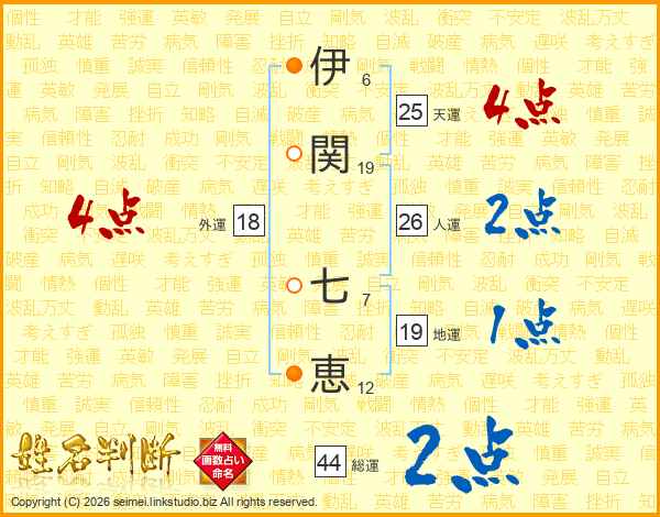 あなたの人生を表す1番重要な運勢です。生涯を通じて影響する総合運となり、主に50歳以降の晩年期に影響を及ぼします。苗字と名前の合計画数。