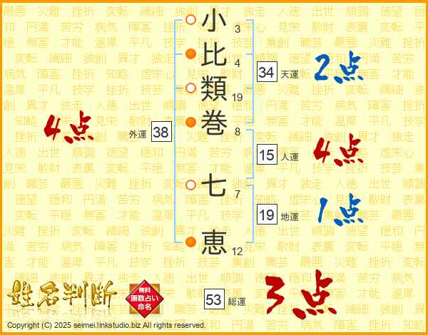 小(3画)比(4画)類(19画)巻(8画) 七(7画)恵(12画)