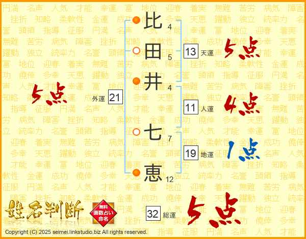 比(4画)田(5画)井(4画) 七(7画)恵(12画)