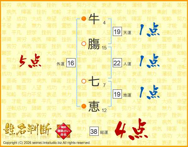 牛膓七恵さんの総運は38画の4点!