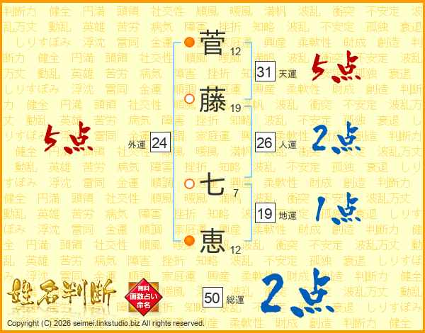 菅(12画)藤(19画) 七(7画)恵(12画)