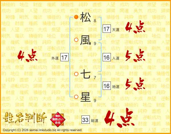 生活面を象徴する運勢です。外部から受ける影響力を表し、結婚運、家庭運や職場、環境への順応性を表します。総運から人運を引いた画数。姓や名が1文字の場合を除く。