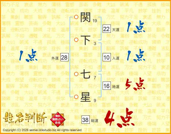 関下七星さんの総運は38画の4点!