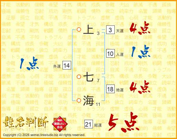 生活面を象徴する運勢です。外部から受ける影響力を表し、結婚運、家庭運や職場、環境への順応性を表します。総運から人運を引いた画数。姓や名が1文字の場合を除く。
