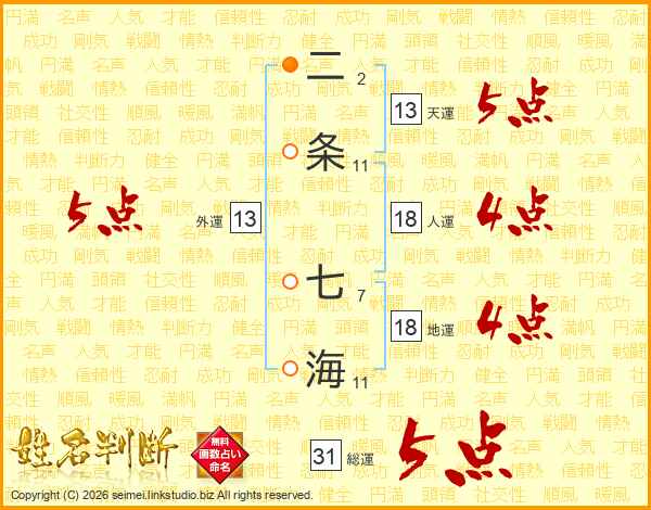 あなたの人生を表す1番重要な運勢です。生涯を通じて影響する総合運となり、主に50歳以降の晩年期に影響を及ぼします。苗字と名前の合計画数。