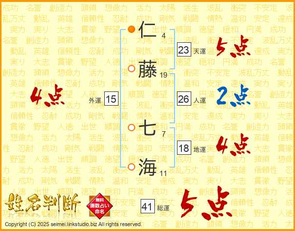 生活面を象徴する運勢です。外部から受ける影響力を表し、結婚運、家庭運や職場、環境への順応性を表します。総運から人運を引いた画数。姓や名が1文字の場合を除く。