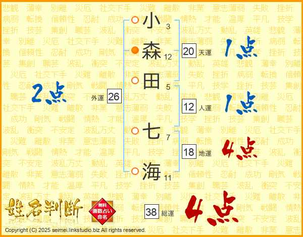 生活面を象徴する運勢です。外部から受ける影響力を表し、結婚運、家庭運や職場、環境への順応性を表します。総運から人運を引いた画数。姓や名が1文字の場合を除く。