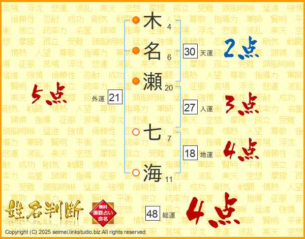 木(4画)名(6画)瀬(20画) 七(7画)海(11画)