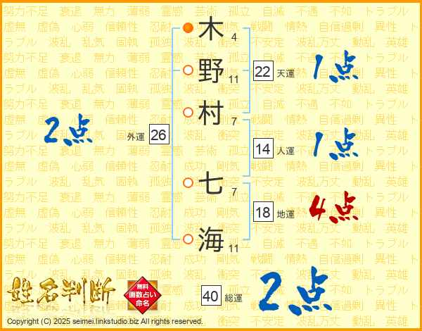 木(4画)野(11画)村(7画) 七(7画)海(11画)