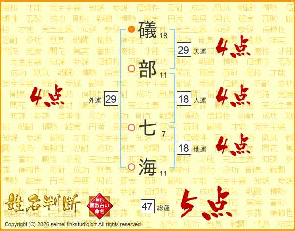 生活面を象徴する運勢です。外部から受ける影響力を表し、結婚運、家庭運や職場、環境への順応性を表します。総運から人運を引いた画数。姓や名が1文字の場合を除く。