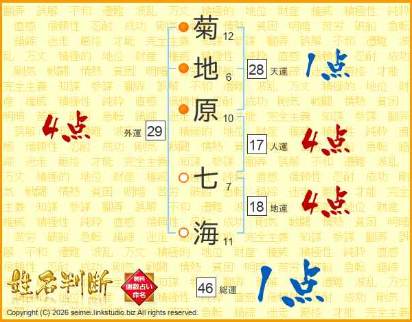 菊地原七海さんの総運は46画の1点!