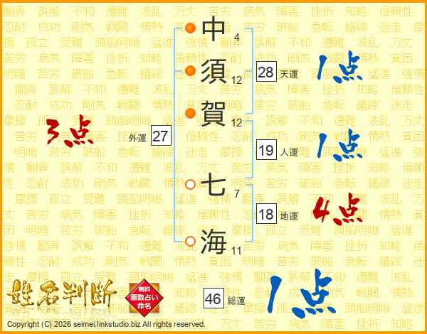 中(4画)須(12画)賀(12画) 七(7画)海(11画)