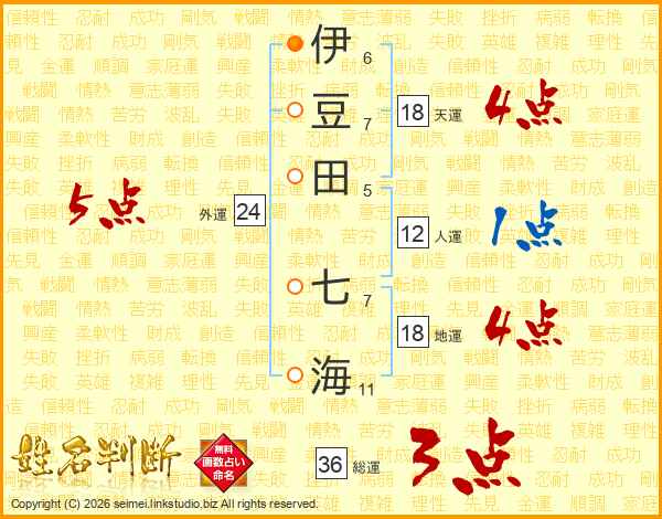 伊(6画)豆(7画)田(5画) 七(7画)海(11画)