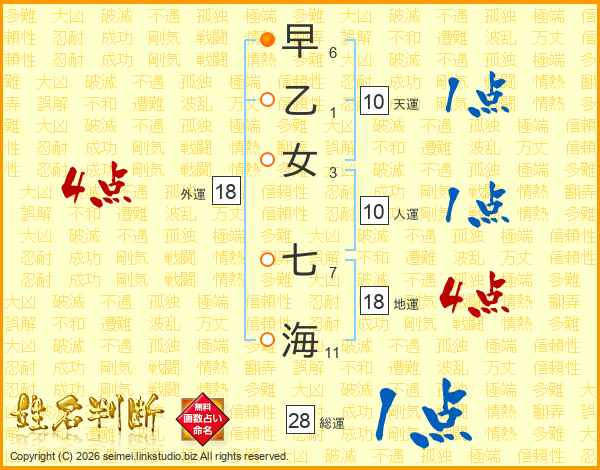 生活面を象徴する運勢です。外部から受ける影響力を表し、結婚運、家庭運や職場、環境への順応性を表します。総運から人運を引いた画数。姓や名が1文字の場合を除く。