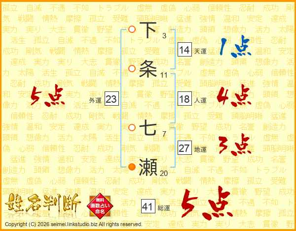 生活面を象徴する運勢です。外部から受ける影響力を表し、結婚運、家庭運や職場、環境への順応性を表します。総運から人運を引いた画数。姓や名が1文字の場合を除く。