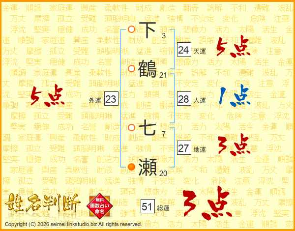 下(3画)鶴(21画) 七(7画)瀬(20画)