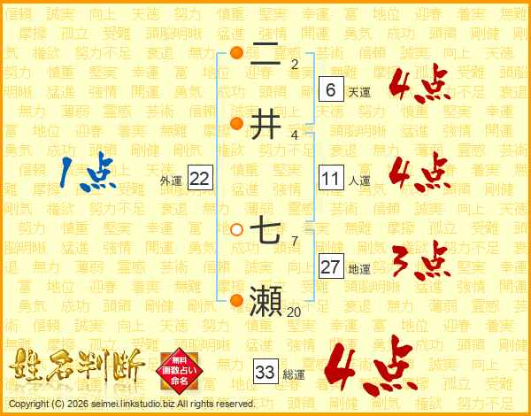 二井七瀬さんの総運は33画の4点!