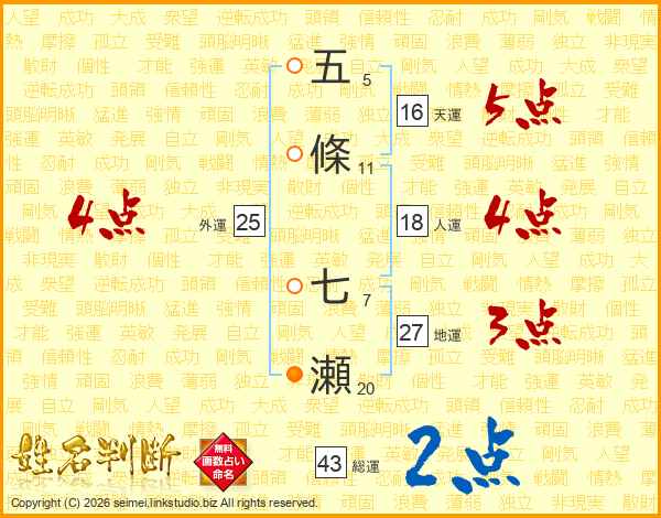 五條七瀬さんの総運は43画の2点!