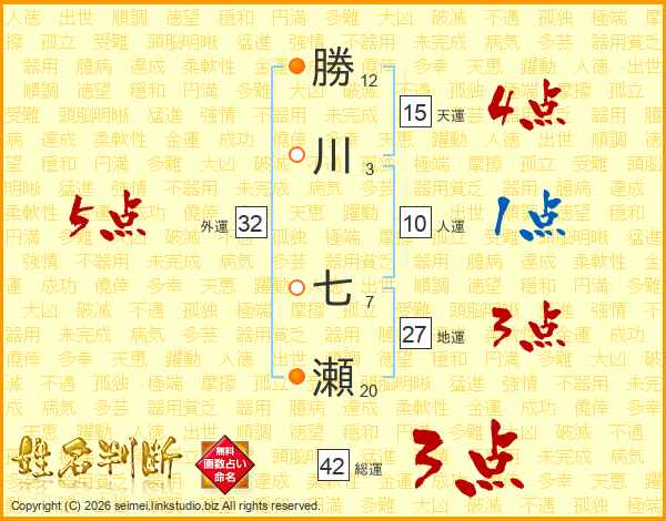 勝(12画)川(3画) 七(7画)瀬(20画)