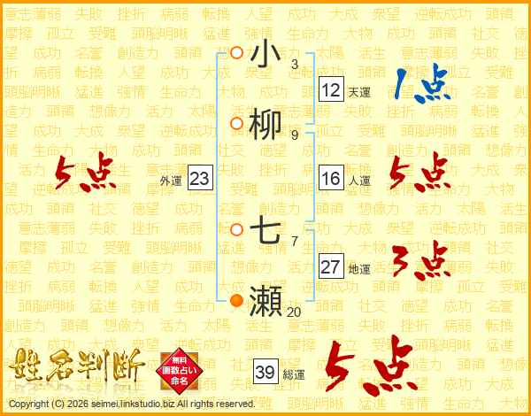 小(3画)柳(9画) 七(7画)瀬(20画)