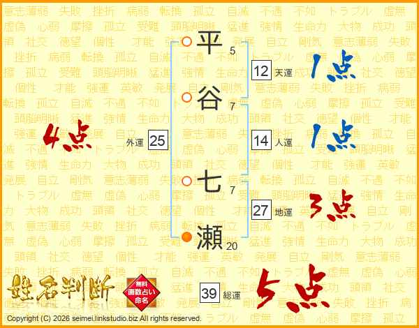 平(5画)谷(7画) 七(7画)瀬(20画)