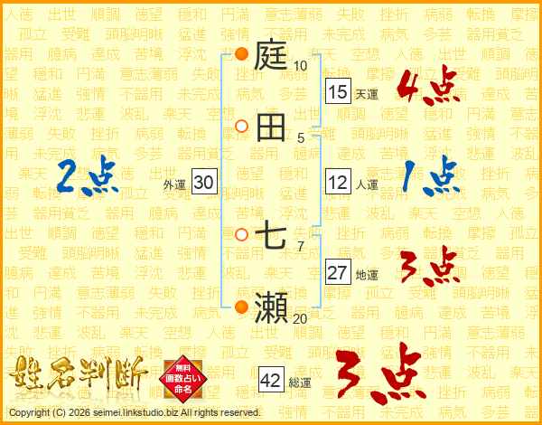 庭(10画)田(5画) 七(7画)瀬(20画)