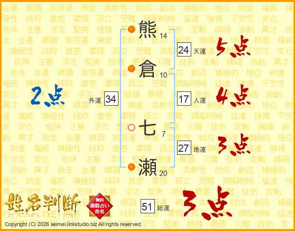 熊(14画)倉(10画) 七(7画)瀬(20画)