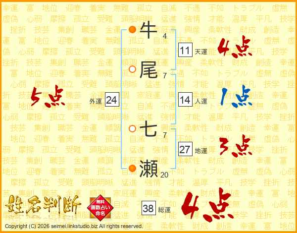 牛(4画)尾(7画) 七(7画)瀬(20画)