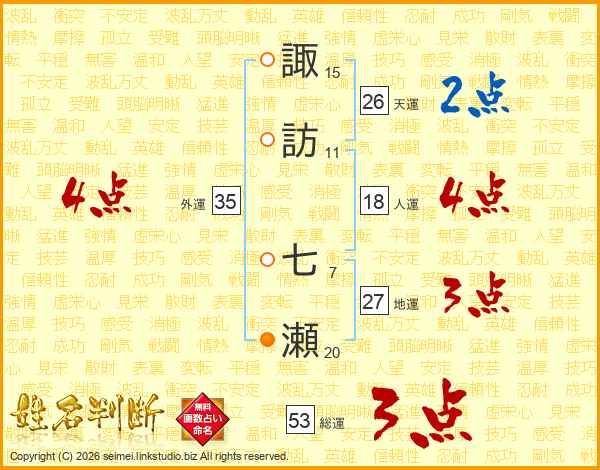 諏(15画)訪(11画) 七(7画)瀬(20画)