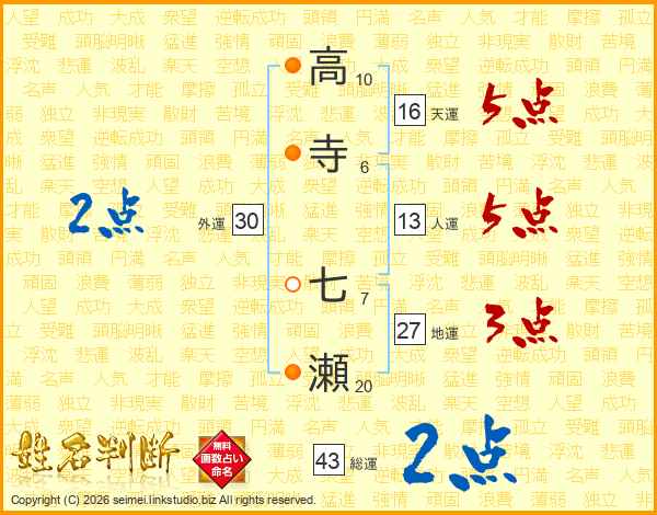 高(10画)寺(6画) 七(7画)瀬(20画)
