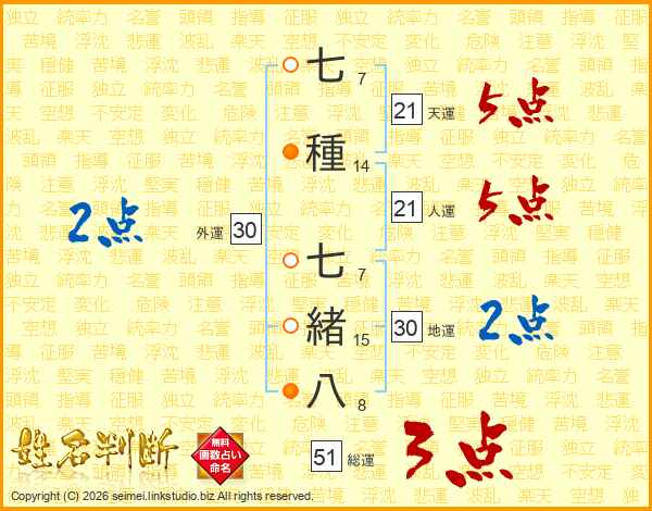七(7画)種(14画) 七(7画)緒(15画)八(8画)