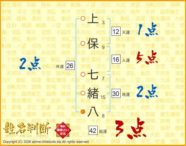 上(3画)保(9画) 七(7画)緒(15画)八(8画)